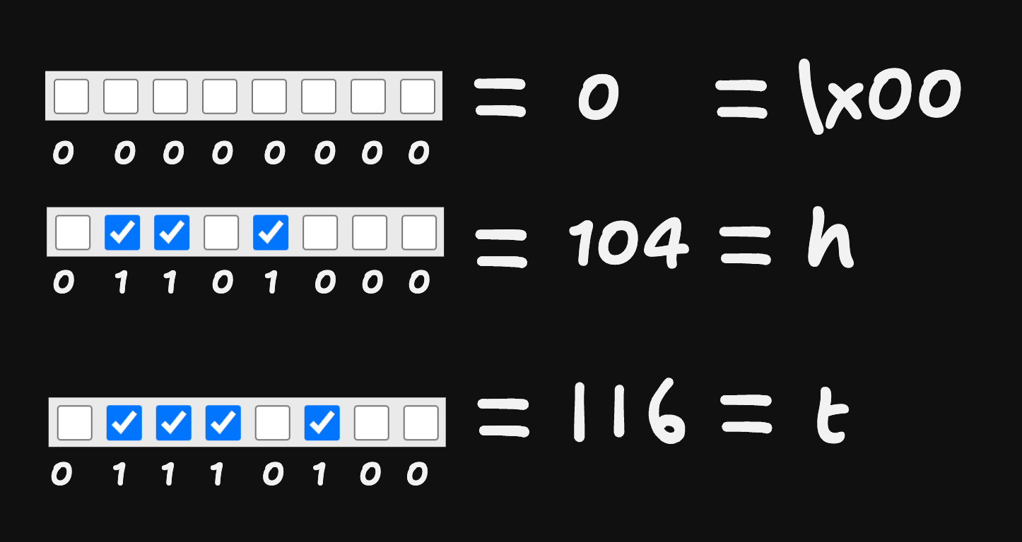 the 'h' is one byte - 8 bits. 8 checkboxes. those 8 checkboxes